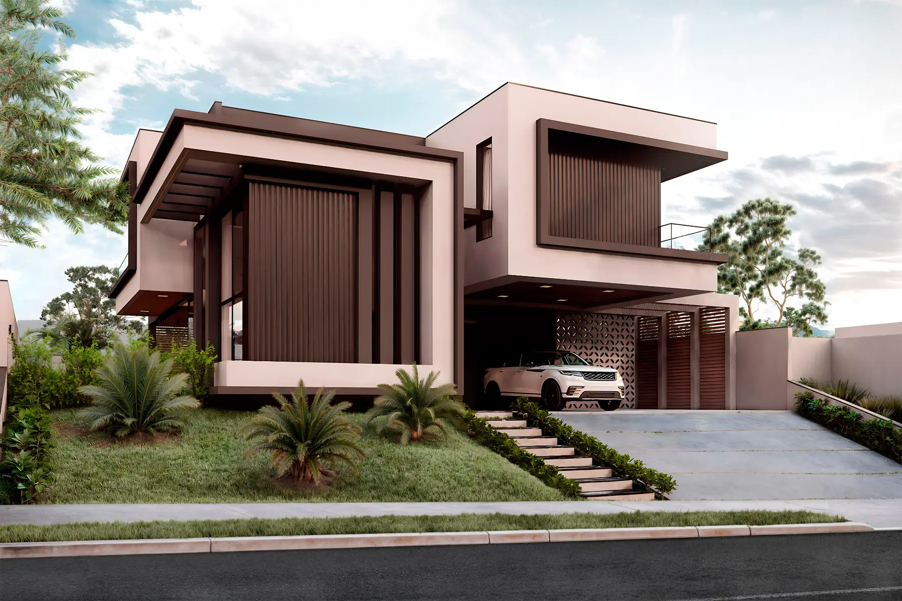 Projeto e Vizualização Arquitetônica - Com um incrível design contemporâneo, esta residência de 320 m² com formas lineares foi projetada com o desafio de ser imponente e simples ao mesmo tempo, reunindo elegância e funcionalidade. Foi desenvolvida para um lançamento imobílário de alto padão.